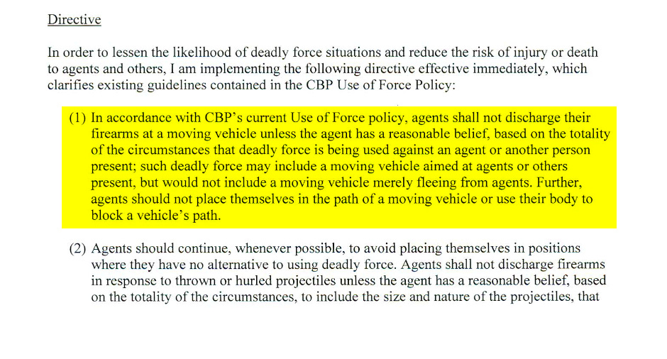 The 2018 DHS policy5, which followed directly from the 2014 CBP Fisher Directive, allowed shooting at a moving vehicle in only two scenarios: