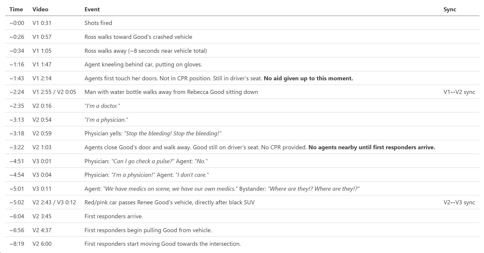 We synced three bystander videos frame by frame to reconstruct exactly what happened between the moment Ross fired and when first responders finally arrived—approximately seven minutes later. The timeline reveals something no single video shows: not just a physician on scene, begging to help, told "I don't care"—but every agent then walking away, leaving Renee Good alone for nearly three minutes. No CPR. No pressure on wounds. Nothing. The evidence doesn't just implicate Ross. It potentially implicates every agent at the scene.