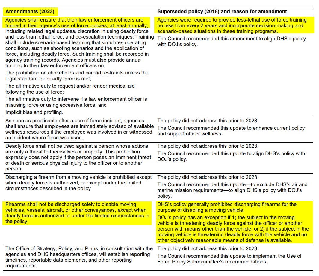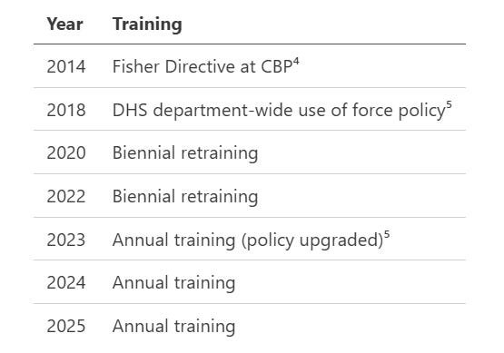 Documents the evolution of DHS use of force policy from 2018 to 2023, including mandatory training requirements. Establishes that Ross would have received training in 2018, 2020, 2022 (biennial), then 2023, 2024, 2025 (annual after 2023 upgrade).