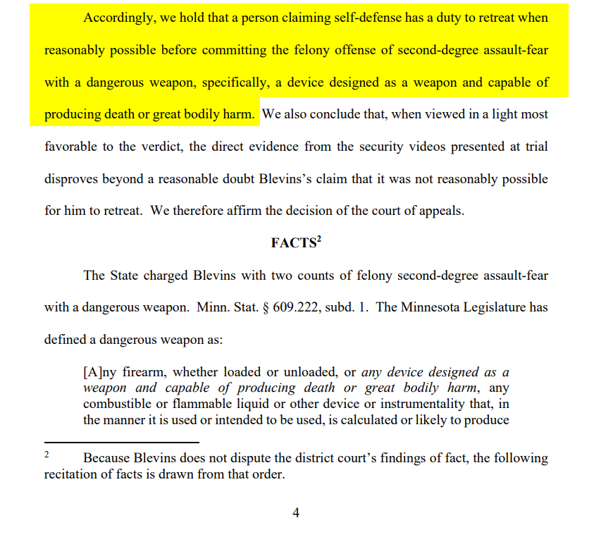 Additionally, under Minnesota law—specifically State v. Blevins8 (2024)—that means self-defense doesn’t apply. The state requires retreat “when reasonably possible” before using deadly force.