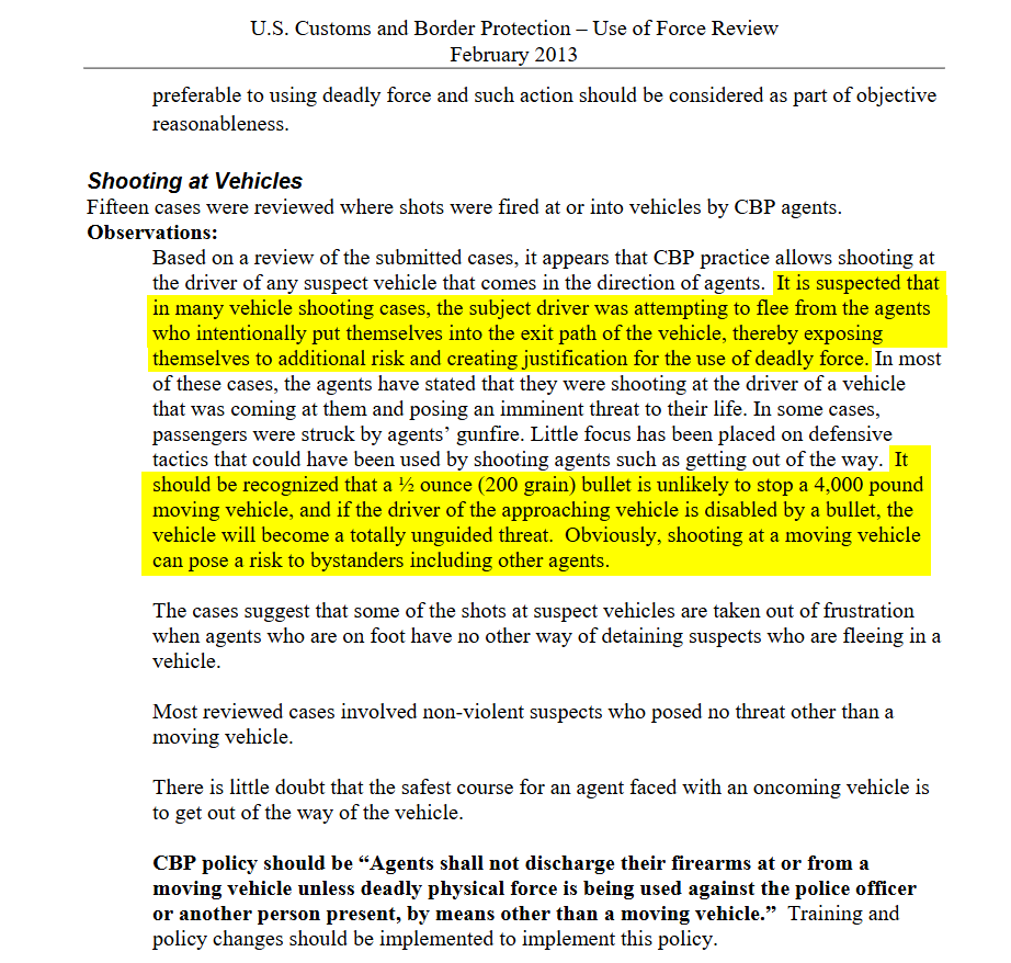In 2013, the Police Executive Research Forum completed a review of 67 deadly force incidents at Customs and Border Protection between 2010 and 2012.3 What they found was damning: CBP agents were “intentionally putting themselves into the exit path of vehicles, thereby exposing themselves to additional risk and creating justification for the use of deadly force.”