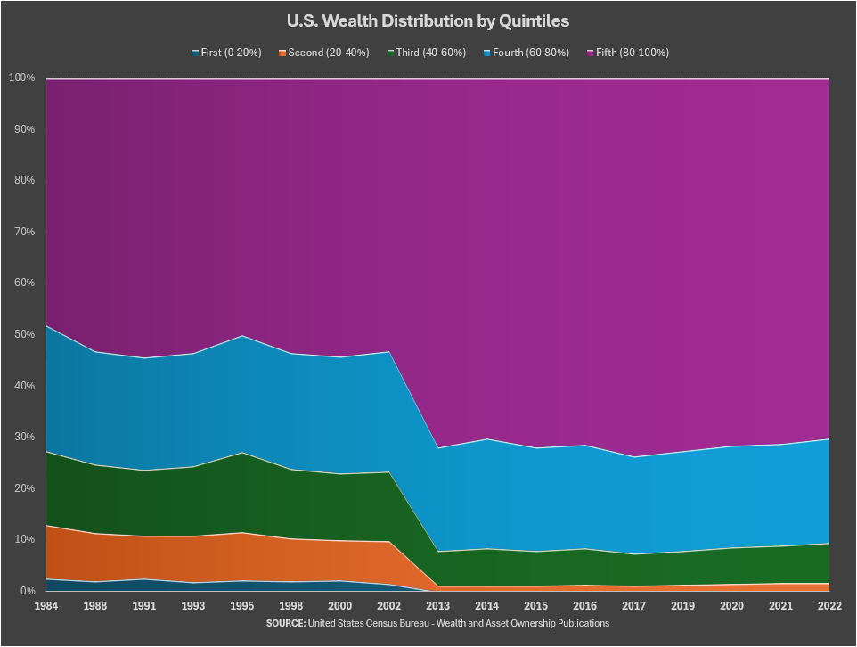 Financial insecurity: For about 60% of Americans—no matter the color of their skin or their origin—building wealth is a pipe dream, no matter how hard they work. Wages have stagnated, housing is unaffordable, and corporate profits are hoarded at the top. Most Americans are stuck in a system designed to keep them struggling. The graph below shows just how drastically wealth has shifted to the top over the decades. The data makes it painfully clear how the majority of Americans have been left behind.
