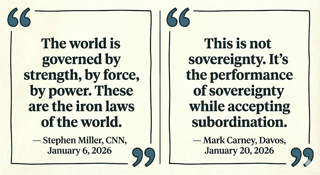 Full transcript of Canadian Prime Minister Mark Carney’s special address at the World Economic Forum’s 56th Annual Meeting, delivered fourteen days after Miller’s CNN interview. Carney declared: “We are in the midst of a rupture, not a transition.” He invoked Václav Havel’s 1978 essay The Power of the Powerless — the parable of a greengrocer who places a sign reading “Workers of the world unite” in his window every morning, not because he believes it but to signal compliance. Havel called this “living within a lie.” Carney applied the metaphor to the international community’s decades-long performance of the rules-based order: “You cannot live within the lie of mutual benefit through integration, when integration becomes the source of your subordination.” He called for middle powers to “stop pretending, to name reality,” and delivered the line: “When we only negotiate bilaterally with a hegemon, we negotiate from weakness. We accept what’s offered. We compete with each other to be the most accommodating. This is not sovereignty. It’s the performance of sovereignty while accepting subordination.” Concluded: “Nostalgia is not a strategy.”