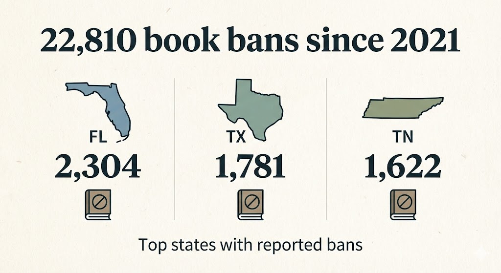 They’re banning books. Not metaphorically. Not in the “cancel culture” sense of a Twitter mob pressuring a publisher. Literally. By law. PEN America has documented 22,810 book ban instances in American public schools since 2021 — a number without precedent in modern American history.13 In the 2024-25 school year alone: 6,870 bans across 23 states and 87 school districts.¹³ Florida led with 2,304. Texas: 1,781. Utah and South Carolina implemented statewide “no read” lists — government-curated catalogs of books that cannot appear in any state-funded school.¹³ The targeted content follows a pattern so consistent it functions as a confession: books about race, sexuality, gender identity, and American history. Not obscenity. Ideas. The Department of Defense even recorded 590 bans in military-connected schools across seven states, two territories, and eleven countries.¹³ PEN America’s assessment: this is the “normalization of book banning” — censorship that has moved from individual challenges to institutionalized government suppression of published literature.