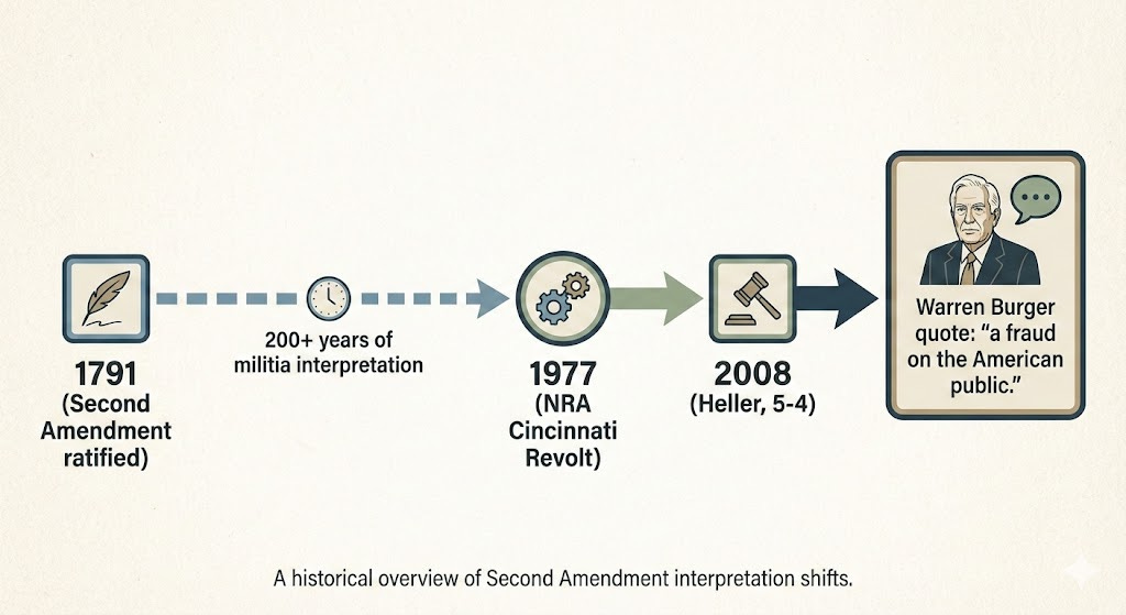And here’s the detail that should stop you cold: Warren Burger — Chief Justice of the United States, appointed by Richard Nixon, a lifelong conservative — called the NRA’s individual-rights interpretation of the Second Amendment “a fraud on the American public.”² A fraud. That wasn’t a liberal critique. That was a Republican-appointed Chief Justice looking at what the NRA was selling and calling it what it was.