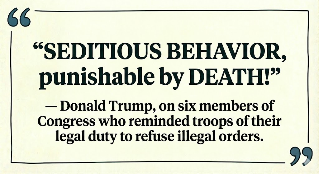 They’re threatening execution for speech. On November 20, 2025, six Democratic members of Congress — all military or intelligence veterans — released a video reminding U.S. service members that they are legally required to refuse illegal orders.15 They were restating existing military law. Nothing more. Trump responded on Truth Social: “SEDITIOUS BEHAVIOR, punishable by DEATH!” He amplified a post reading: “HANG THEM GEORGE WASHINGTON WOULD!!”¹⁵ He called for their arrest and trial. Senate Minority Leader Schumer: “The president of the United States is calling for the execution of elected officials.”¹⁵ The six lawmakers responded: “What’s most telling is that the president considers it punishable by death for us to restate the law.”¹⁵