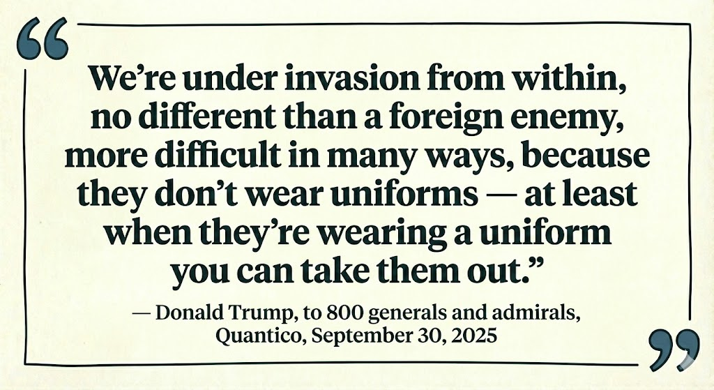 The most operationally significant instance of Trump’s “enemy within” rhetoric: standing before approximately 800 generals and admirals at Marine Corps Base Quantico on September 30, 2025, Trump declared: “This is a war too. It’s a war from within.” He called critics “vicious people that we have to fight,” singled out San Francisco, Chicago, New York, and Los Angeles, and told commanders to treat those cities as military “training grounds.” He said: “We’re under invasion from within, no different than a foreign enemy, but more difficult in many ways, because they don’t wear uniforms — at least when they’re wearing a uniform you can take them out.” The commander-in-chief, instructing his armed forces that his political opponents and their cities are legitimate military targets.