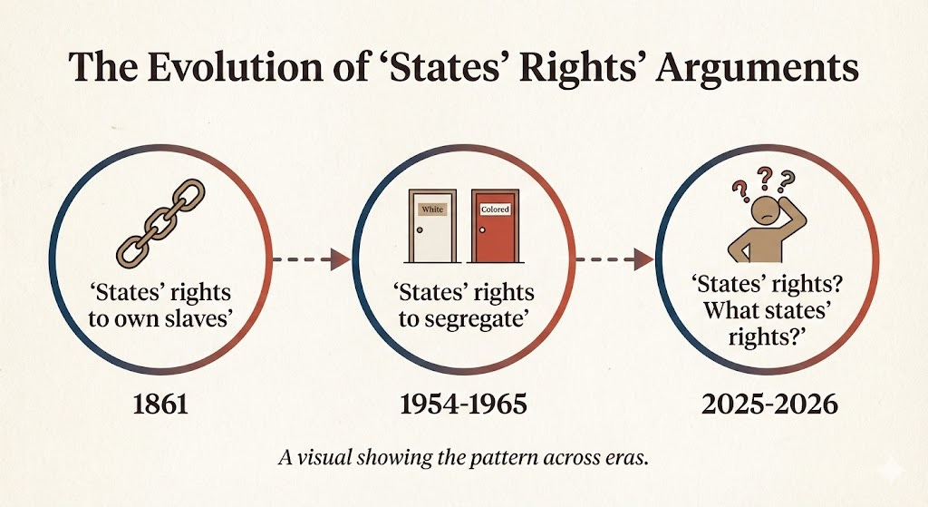 Not because states don’t have rights. They do. But because “states’ rights” has never, not once in 165 years, been functionally deployed by the American right as a neutral principle of federalism. It has been deployed as a selective doctrine of power: invoked when federal authority threatens a racial or social hierarchy the movement is committed to preserving, and abandoned when federal power serves that hierarchy instead. And the moment the federal government stopped threatening that hierarchy — the moment the federal government became the hierarchy — “states’ rights” vanished overnight.