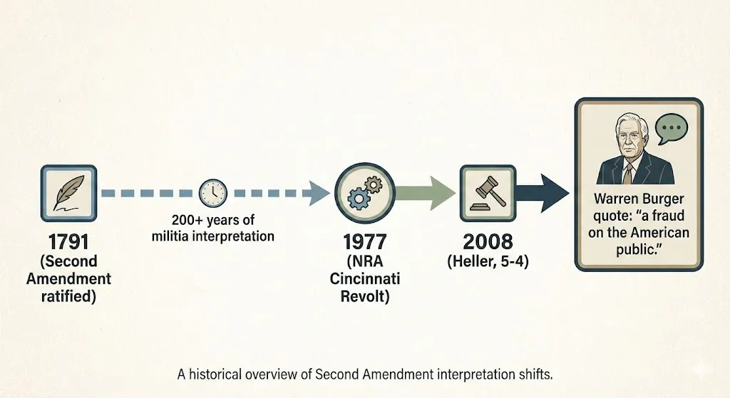 And here's the detail that should stop you cold: Warren Burger — Chief Justice of the United States, appointed by Richard Nixon, a lifelong conservative — called the NRA's individual-rights interpretation of the Second Amendment "a fraud on the American public."² A fraud. That wasn't a liberal critique. That was a Republican-appointed Chief Justice looking at what the NRA was selling and calling it what it was.