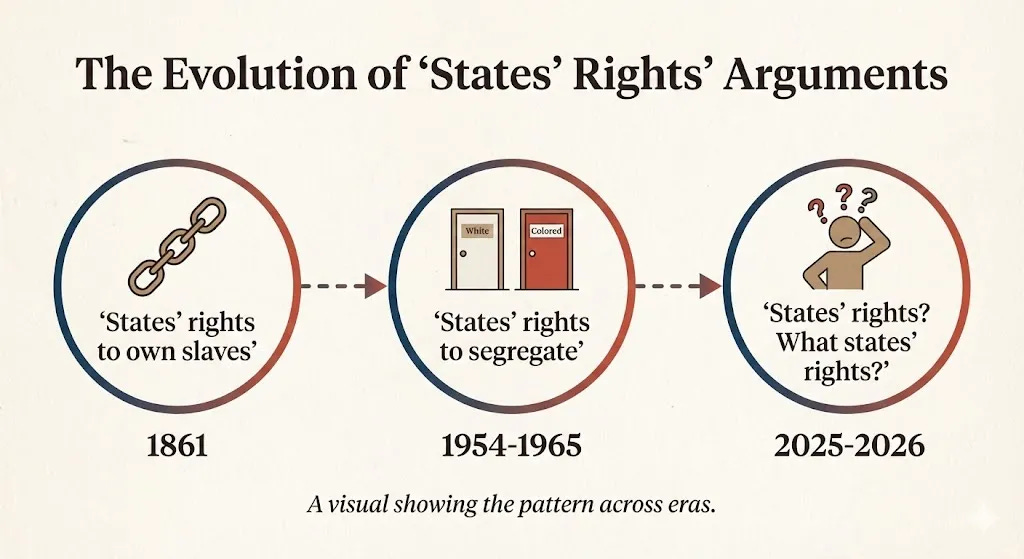 This is the oldest trick in the book. Literally. "States' rights" has been the go-to justification for conservative power in America for 165 years — longer than any other phrase in our political vocabulary. It's invoked with the reverence of scripture, as though the Tenth Amendment were a moral principle rather than a structural provision. And it is, without exaggeration, the single most successful lie in American political history.