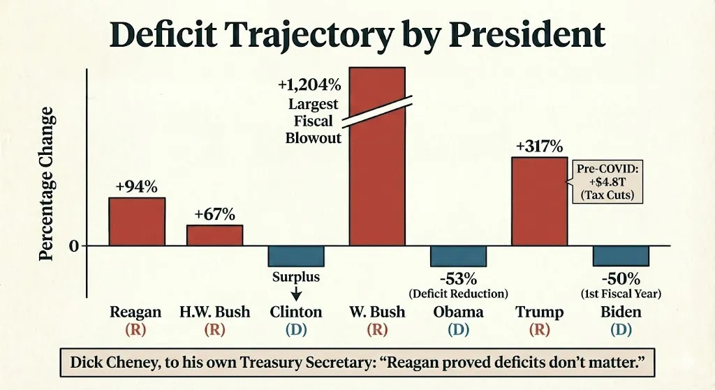 Documents the Cheney quote that encapsulates the entire fraud: Vice President Dick Cheney told Treasury Secretary Paul O'Neill, "Reagan proved deficits don't matter." This was revealed publicly in 2004. The article traces the fiscal record from Reagan (debt grew 190%) through the Bush administrations and establishes the repeating pattern: Republicans preach fiscal conservatism to get elected, explode the debt through tax cuts and military spending, hand Democrats a fiscal catastrophe, then blame Democrats for not cleaning it up fast enough.