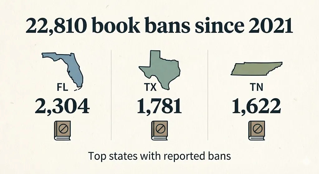 They're banning books. Not metaphorically. Not in the "cancel culture" sense of a Twitter mob pressuring a publisher. Literally. By law. PEN America has documented 22,810 book ban instances in American public schools since 2021 — a number without precedent in modern American history.13 In the 2024-25 school year alone: 6,870 bans across 23 states and 87 school districts.¹³ Florida led with 2,304. Texas: 1,781. Utah and South Carolina implemented statewide "no read" lists — government-curated catalogs of books that cannot appear in any state-funded school.¹³ The targeted content follows a pattern so consistent it functions as a confession: books about race, sexuality, gender identity, and American history. Not obscenity. Ideas. The Department of Defense even recorded 590 bans in military-connected schools across seven states, two territories, and eleven countries.¹³ PEN America's assessment: this is the "normalization of book banning" — censorship that has moved from individual challenges to institutionalized government suppression of published literature.