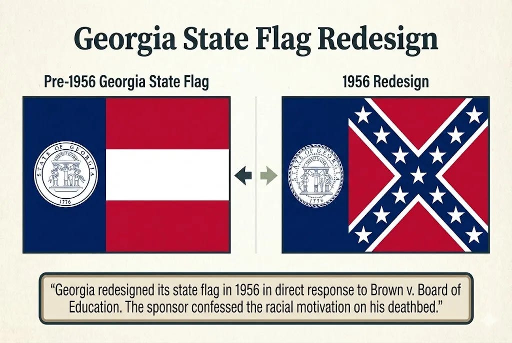 Documents in explicit detail that Georgia added the Confederate battle flag to its state flag in 1956 specifically as a response to Brown v. Board of Education. The entire 1956 legislative session was devoted to Governor Marvin Griffin's platform of "massive resistance" to integration. Floor leader Denmark Groover told the press the flag would "show that we in Georgia intend to uphold what we stood for, will stand for and will fight for" — meaning legal segregation. No public hearings, no referendum. The flag flew for 45 years. Groover denied racial motivation until his deathbed in 2001, when he finally admitted it. Published by the New Georgia Encyclopedia, a National Endowment for the Humanities project.