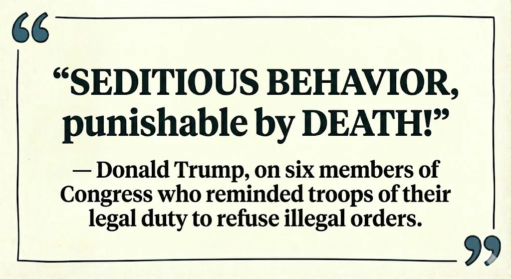 They're threatening execution for speech. On November 20, 2025, six Democratic members of Congress — all military or intelligence veterans — released a video reminding U.S. service members that they are legally required to refuse illegal orders.15 They were restating existing military law. Nothing more. Trump responded on Truth Social: "SEDITIOUS BEHAVIOR, punishable by DEATH!" He amplified a post reading: "HANG THEM GEORGE WASHINGTON WOULD!!"¹⁵ He called for their arrest and trial. Senate Minority Leader Schumer: "The president of the United States is calling for the execution of elected officials."¹⁵ The six lawmakers responded: "What's most telling is that the president considers it punishable by death for us to restate the law."¹⁵
