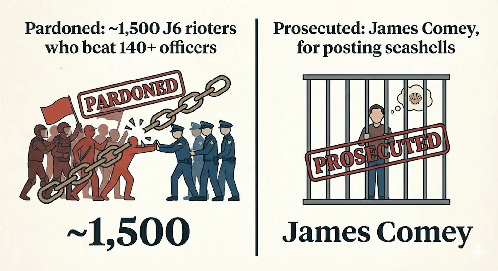 They're investigating Instagram posts. In May 2025, former FBI Director James Comey — a private citizen — posted a photo of seashells on a beach that appeared to form "86 47." His caption: "Cool shell formation on my beach walk."16 "86" is diner slang for "get rid of" (Merriam-Webster).¹⁶ The response: the Secret Service opened a formal investigation. FBI Director Kash Patel announced FBI coordination. DHS Secretary Kristi Noem publicly accused Comey of calling for assassination. Republican congressman Andy Ogles demanded he "be in handcuffs."¹⁶ By late 2025, Comey was formally indicted — a federal judge dismissed the indictment, but Patel vowed to continue pursuing him.¹⁶ A private citizen posted a photo of seashells, and the full weight of federal law enforcement descended.