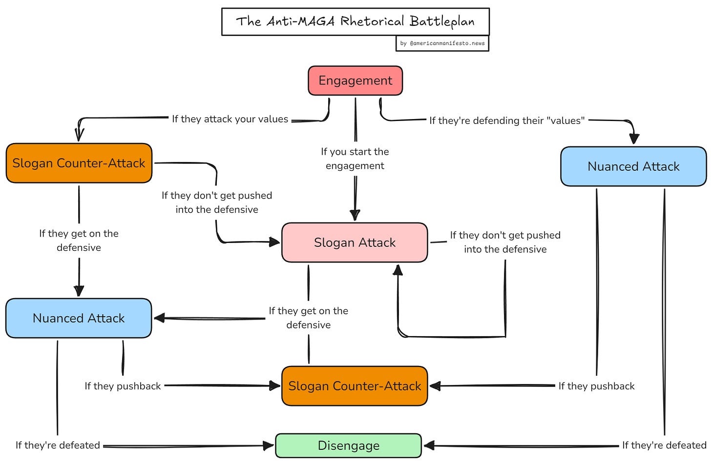 Look at the battleplan diagram. Count the nodes. There are five: Engagement, Slogan Attack, Slogan Counter-Attack, Nuanced Attack, and Disengage. Notice what’s missing — there is no “Defense” node. That’s not an oversight. It’s the thesis.