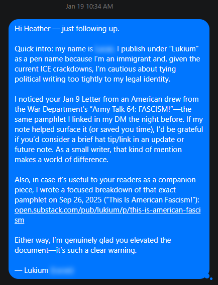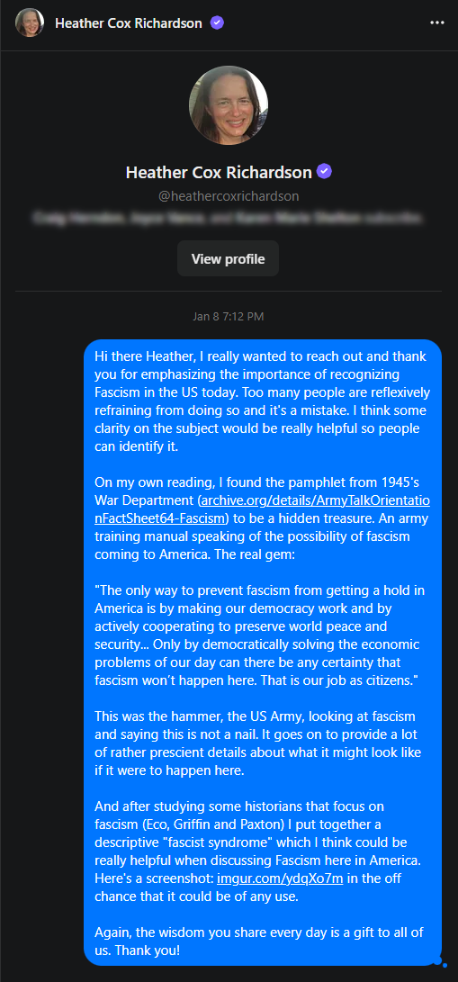 Then on January 8, 2026, historian Heather Cox Richardson did a live video about fascism. She was emphatic—”Recognizing this administration as fascist is now imperative.” I was genuinely excited. Here was someone with an enormous creator saying what needed to be said.