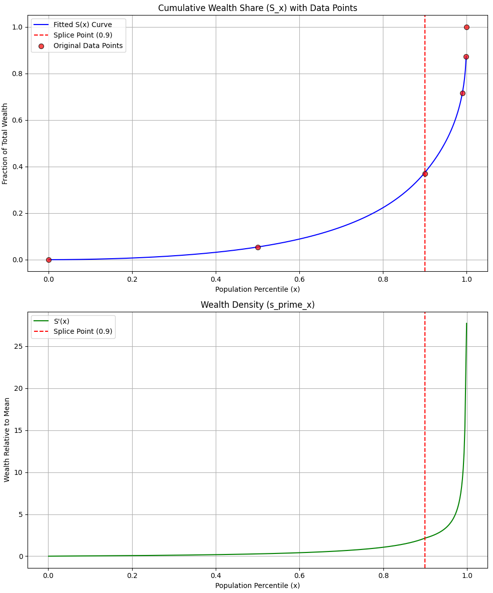 As you can see in the top graph, the blue curve represents the cumulative wealth held by the population. Following it to the 0.9 mark on the horizontal axis, you’ll see it shows that the bottom 90% of Americans hold just 36.9% of the nation’s wealth. Half of Americans, the bottom 50%, hold only 5.4% of the country’s wealth.