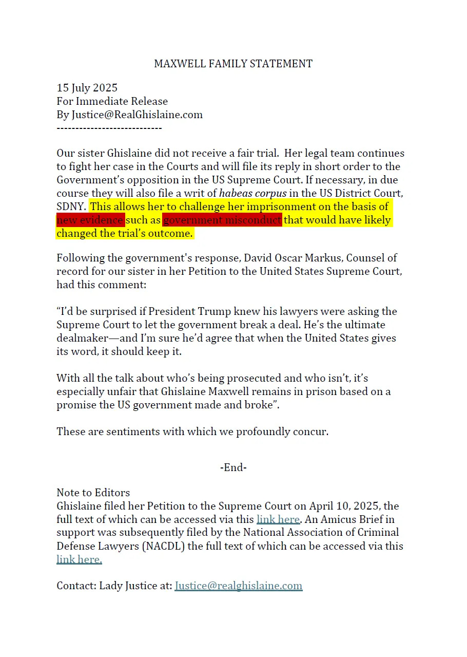 Matt Lavietes, Ghislaine Maxwell's family appeals to Trump amid battle over Epstein files, NBC News, (July 16, 2025)