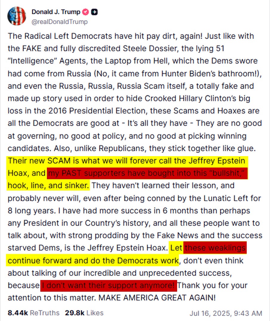 Trump fires back at ‘stupid Republicans’ calling for release of Epstein files, NBC News, (July 16, 2025)