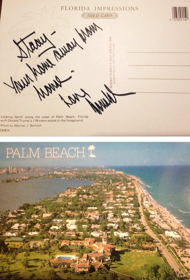 She provided contemporaneous details to friends, passed a polygraph examination, and produced a postcard sent by Trump inviting her to Mar-a-Lago: “Stacey — Your home away from home. Love, Donald”.1516