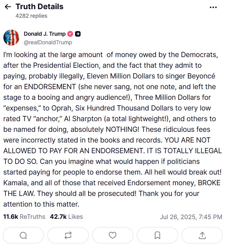 Donald J. Trump, Truth Social Post - Democrats “Illegally” Paid Celebrities for Endorsements, Truth Social, (July 26, 2025)