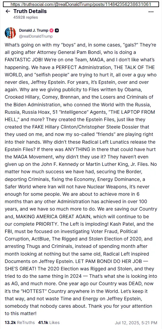 Donald Trump, Post on Truth Social, Truth Social (July 12, 2025).